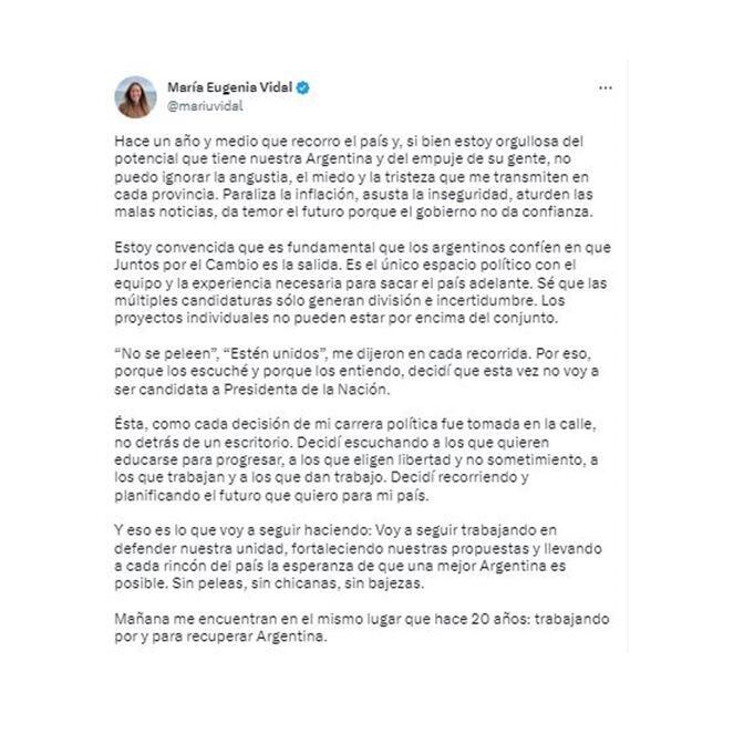 Sumado a esto, Vidal también siente que al ser joven y tener tiempo, aún no es momento de su candidatura presidencial. Está convencida de que su experiencia de estos meses le sirvió para recorrer el país y hablar con la gente en las provincias, y que eso va a seguir haciéndolo. Por eso, irá a apoyar a los candidatos de Juntos por el Cambio en el interior. Además, tampoco quería seguir generando ruidos en el PRO y cree que con esta decisión se descomprimirá la interna.