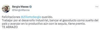 El ministro de Economía, Sergio Massa, saludó por Twitter al gobernador reelecto Sergio Ziliotto: “Felicitaciones @ZiliottoSergio querido. Trabajar por el desarrollo industrial, bancar el gasoducto como sueño del país y avanzar en lo productivo aún con la sequía, tiene premio”.