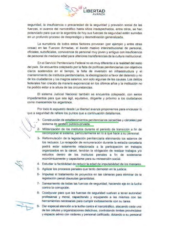En cuanto a las armas, ratifica lo dicho por el diputado nacional en varias oportunidades, que está de acuerdo con desregular el marco normativo y facilitar su libre portación. Desde la seguridad, también impulsa la construcción de cárceles con sistemas de gestión público-privada; “la militarización de los institutos” y la unificación del sistema militar de Defensa Nacional y la Seguridad interior, la reducción de la edad de imputabilidad de los menores y “tolerancia cero contra la delincuencia”, que implique “eliminar de la legislación penal cláusulas garantistas”.