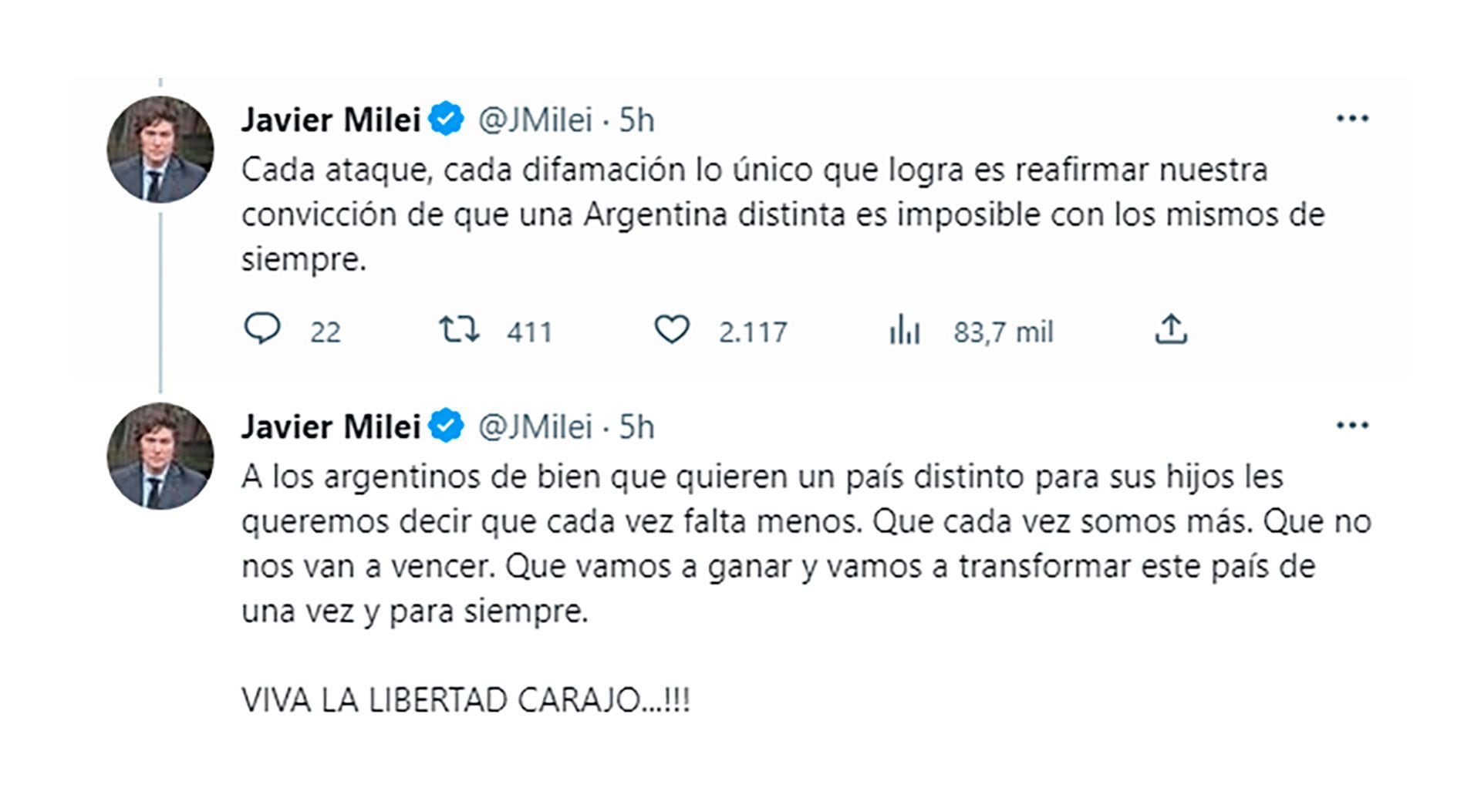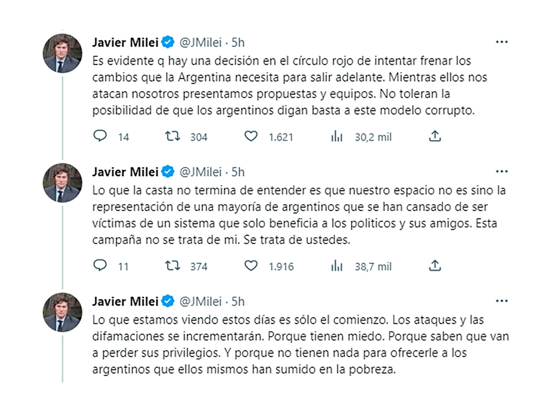 Sin embargo, Milei remarcó que “cada ataque, cada difamación, lo único que logra es reafirmar” su “convicción de que una Argentina distinta es imposible con los mismos de siempre”.