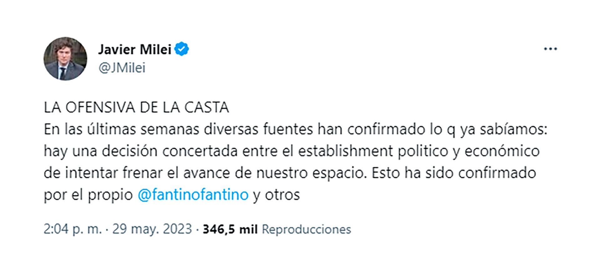 Bajo el título de “La ofensiva de la casta”, el economista compartió un extenso texto en el que sostuvo que “en las últimas semanas, diversas fuentes han confirmado lo que ya” se sabía, que “hay una decisión concertada entre el establishment político y económico de intentar frenar el avance” de su espacio.