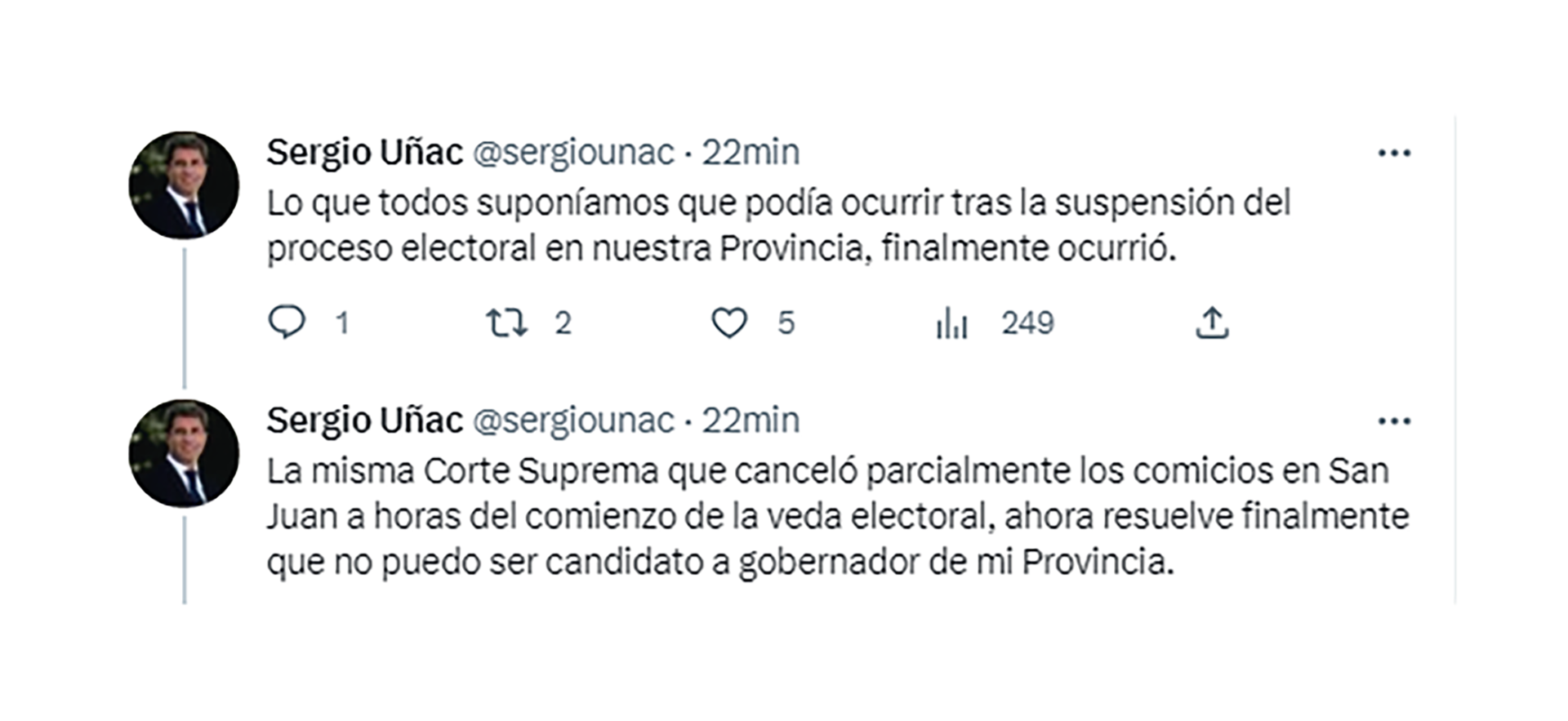 “Lo que todos suponíamos que podía ocurrir tras la suspensión del proceso electoral en nuestra Provincia, finalmente ocurrió. La misma Corte Suprema que canceló parcialmente los comicios en San Juan a horas del comienzo de la veda electoral, ahora resuelve finalmente que no puedo ser candidato a gobernador de mi Provincia. La mala comedia de enredos que empezó el 9 de mayo y sumó idas, vueltas, marchas y contramarchas, culmina con un final que todos podíamos prever: la Corte Suprema avasallando cualquier rasgo de federalismo y violando la autonomía de San Juan”, expresó Uñac en la misiva.