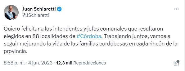 “Quiero felicitar a los intendentes y jefes comunales que resultaron elegidos en 88 localidades de Córdoba”, manifestó el gobernador Juan Schiaretti al término de la jornada electoral. “Trabajando juntos, vamos a seguir mejorando la vida de las familias cordobesas en cada rincón de la provincia”, agregó.