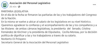 “En el día de la fecha se firmaron las paritarias de las y los trabajadores del Congreso de la Nación. En la misma se vuelve a ubicar al salario de los legislativos en su nivel histórico. Queremos agradecer la confianza y el acompañamiento de las y los compañeros y a las titulares de ambas cámaras legislativas, la presidenta del Senado, Cristina Fernández de Kirchner y la presidenta de Diputados, Cecilia Moreau, por la decisión política de dignificar a las y los trabajadores a través de su salario”, publicó Di Próspero en las redes sociales del gremio APL.