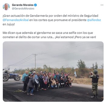 “¡Gran actuación de Gendarmería por orden del ministro de Seguridad Aníbal Fernández en los cortes que promueve el presidente Alberto Fernández en Jujuy!”, expresó en tono irónico a través de la red social Twitter. “Me dicen que además el gendarme se saca una selfie con los que cometen el delito de cortar una ruta… ¡Así estamos! ¡Pero ya se van!”, agregó en tono electoral el precandidato a vicepresidente de Horacio Rodríguez Larreta en una de las listas de Juntos por el Cambio.