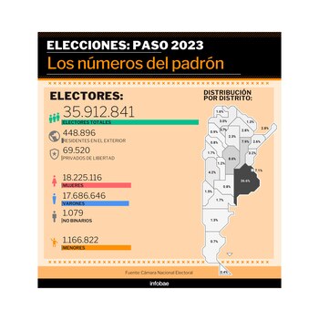 Según la última actualización del padrón, el número de electores para estos comicios asciende a 35.394.425. Si se suman los privados de libertad (69.520) y los argentinos residentes en el exterior (448.896), esa cifra escala a casi 36 millones. De ese total, el 50,74% son mujeres (18.225.116) y el 49,24% hombres (17.686.646). Otras 1.079 personas se identificaron como no binarias.