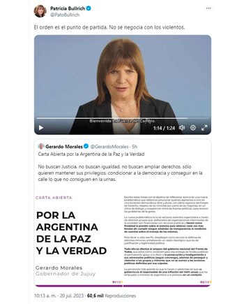 A esta carta, la precandidata presidencial Patricia Bullrich -y ex jefa del PRO- respondió, vía Twitter: “El orden es el punto de partida, No se negocia con los violentos”, y abajo publicó su spot de campaña.
