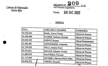 En el listado también aparece Augusto Casaretto (22), hijo del diputado Marcelo Casaretto, que se hizo conocido a nivel nacional por mirar un partido de básquet en plena sesión. El joven de apenas 22 años fue designado en la planta permanente del Instituto del Seguro de la provincia de Entre Ríos.