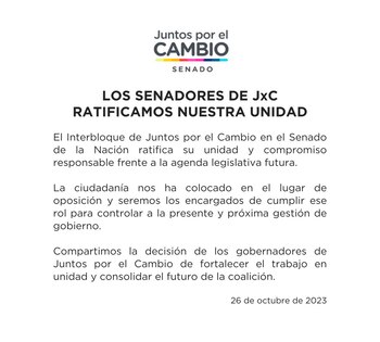 Los senadores, en un escueto comunicado, sostuvieron que “el interbloque de Juntos por el Cambio en el Senado de la Nación ratifica su unidad y compromiso responsable frente a la agenda legislativa futura”. “La ciudadanía nos ha colocado en el lugar de oposición y seremos los encargados de cumplir ese rol para controlar a la presente y próxima gestión de gobierno”, afirmaron en el texto.