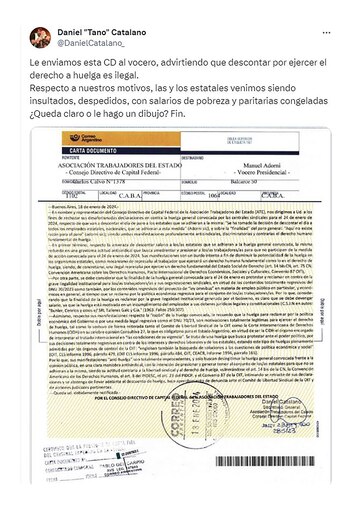 “Reafirmo cada palabra, quien no trabaje no va a cobrar. El derecho a huelga está garantizado y no tiene relación con que se cobre o no se cobre. Lo que no vamos a hacer que los argentinos paguen a un empleado estatal que no vaya a trabajar. Por otro lado, les sugiero, a modo de recomendación, que consulte a sus abogados ya que yo no voy a hacer ningún descuento de manera personal y la carta se me envió de manera personal. Simplemente soy el vocero presidencial. Les ruego que se asesoren como corresponde cuando me manden una carta documento”, dijo.