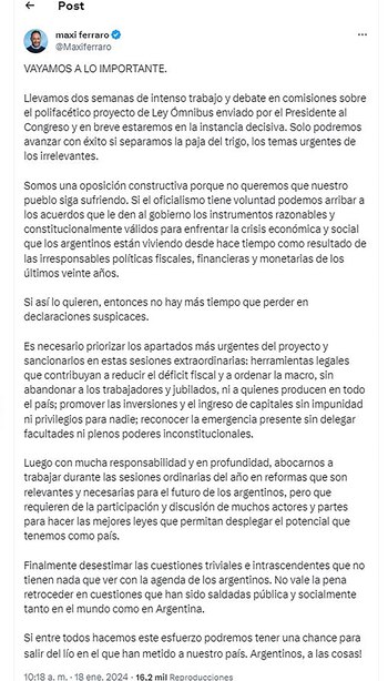 “Somos una oposición constructiva porque no queremos que nuestro pueblo siga sufriendo. Si el oficialismo tiene voluntad, podemos arribar a los acuerdos que le den al gobierno los instrumentos razonables y constitucionalmente válidos para enfrentar la crisis económica y social que los argentinos están viviendo desde hace tiempo como resultado de las irresponsables políticas fiscales, financieras y monetarias de los últimos veinte años”, escribió Ferraro en su cuenta de X.