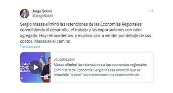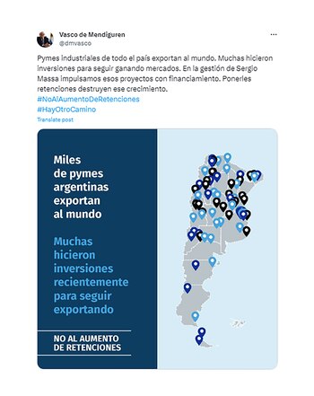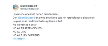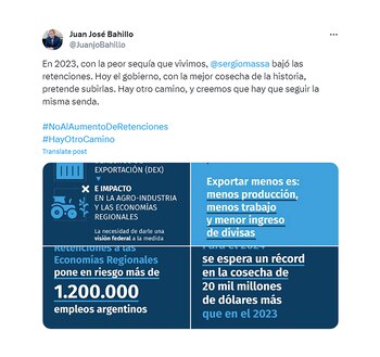 Con los hashtags #NoAlAumentoDeRetenciones y #HayOtroCamino, recordaron que el ex ministro Massa bajó las retenciones en medio de “la peor sequía”, en 2023, y “hoy el gobierno, con la mejor cosecha de la historia, pretende subirlas”. Se espera “un récord en la cosecha de 20 mil millones de dólares más que en el 2023″.