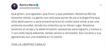 “Que griten, que agredan, que lloren y que pataleen. Nosotros NO les tenemos miedo. La gente nos votó para poner de pie a la Argentina que ellos destruyeron y para encaminarla en el rumbo para volver a ser una potencia mundial, donde los violentos ya no tienen lugar”, respondió el legislador porteño en sus redes sociales. “Nosotros tenemos el coraje y la determinación necesarias para lograrlo, y vamos a ir con todo hacia adelante. Jamás vamos a retroceder. Sus insultos y sus agresiones son una medalla en mi pecho. VIVA LA LIBERTAD CARAJO”, se descargó en su cuenta de X el ex candidato a jefe de Gobierno porteño de LLA.
