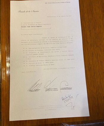 La nota, que lleva la firma del senador radical Victor Zimmermann, su par del bloque Unión Federal Carlos Espínola y el diputado radical Francisco Monti, le solicita al presidente de la bicameral que “convoque” para este jueves al Jefe de Gabinete, Nicolás Posse; al ministro de Economía, Luis Caputo; al secretario de Transformación del Estado y Función Pública, Armando Guibert; al de Agricultura, Ganadería y Pesca, Fernando Vilella; al de Trabajo, Empleo y Seguridad Social, Omar Yasin; al de Salud, Mario Russo y a la “autoridad máxima” del Anses, quien desde hace unos días es Mariano de los Heros