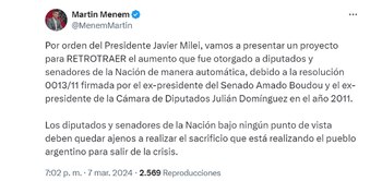 A través de un mensaje en las redes sociales, el titular de la Cámara de Diputados anunció que “por orden del Presidente Javier Milei” el oficialismo presentará un proyecto para “retrotraer” el aumento. Además buscó tomar distancia de la medida que él mismo firmó al señalar que el incremento de dietas se otorgó de manera “automática” debido a la resolución 0013/11 firmada por el ex-presidente del Senado Amado Boudou y el ex-presidente de la Cámara de Diputados Julián Domínguez en el año 2011.