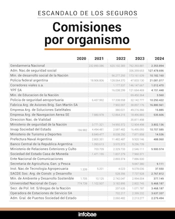 Los auditores también armaron un ranking con los organismos públicos y entes que pagaron más comisiones. Por escándalo, en primer lugar quedó la Gendarmería, con $1.617.740.243. Luego aparecen la ANSES ($463.837.349), el Ministerio de Desarrollo Social ($239.621.093), Policía Federal, Corredores Viales e YPF.
