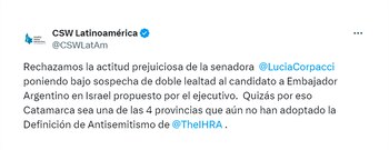 “Rechazamos la actitud prejuiciosa de la senadora Lucía Corpacci poniendo bajo sospecha de doble lealtad al candidato a Embajador Argentino en Israel propuesto por el ejecutivo. Quizás por eso Catamarca sea una de las 4 provincias que aún no han adoptado la Definición de Antisemitismo de @TheIHRA”, escribieron con mención a la Alianza Internacional para el Recuerdo del Holocausto.