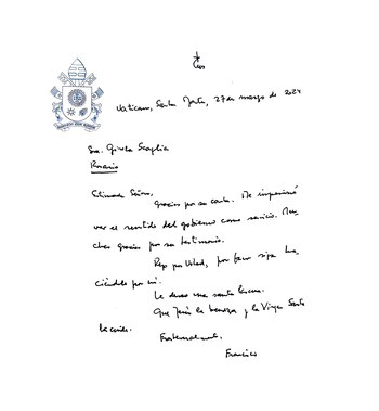 Aunque la audiencia no fue posible, Scaglia le envió el miércoles una carta, en la que, entre otras cuestiones, resumió las acciones de su gobierno para mejorar la convivencia social en la ciudad de Rosario. Ese mismo día, por la noche, la funcionaria recibió una respuesta de puño y letra del Sumo Pontífice.