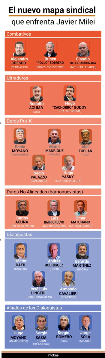 El gobierno de Milei afrontará una etapa crucial para llevar adelante sus políticas mientras enfrenta una recomposición del sindicalismo que tiende a una mayor atomización y radicalización de sus dirigentes. Hay, al menos, 6 grandes sectores en que se divide hoy el mapa gremial. Están los “combativos”, enrolados en las distintas variantes del trotskismo, entre quienes se destacan Alejandro Crespo, titular del Sindicato del Neumático; Rubén “Pollo” Sobrero, de la Unión Ferroviaria, y Claudio Dellecarbonara, de los metrodelegados, aunque hay muchos más dirigentes, delegados e integrantes de comisiones internas. En épocas de crisis socioeconómica, como la actual, la izquierda suele crecer como consecuencia del malestar en las bases y de la pasividad del sindicalismo peronista.