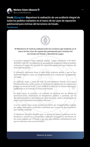 “Dispusimos la realización de una auditoría integral de todos los pedidos realizados en el marco de las Leyes de reparación patrimonial para víctimas del terrorismo de Estado”, escribió el ministro Mariano Cúneo Libarona, dando cuenta del comunicado.