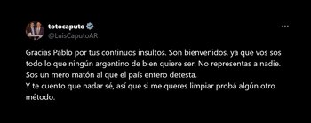En el cierre de su posteo, Caputo fue igualmente duro: “Y te cuento que nadar sé, así que si me querés limpiar probá algún otro método”, escribió.