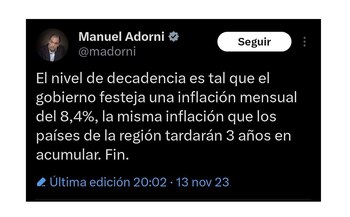 Más allá del dato, uno de los funcionarios que quedó en el centro de los comentarios en redes sociales fue el vocero presidencial, Manuel Adorni, ya que el año pasado, al conocerse el índice de inflación de octubre, que fue del 8,4%, publicó un duro mensaje en las redes sociales contra el entonces Gobierno de Alberto Fernández.