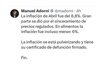 “El nivel de decadencia es tal que el gobierno festeja una inflación mensual del 8,4%, la misma inflación que los países de la región tardarán 3 años en acumular. Fin”, fue el mensaje entonces del actual portavoz, quien ayer, también en las redes, celebró el índice de 8,8% correspondiente a abril.