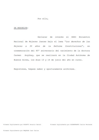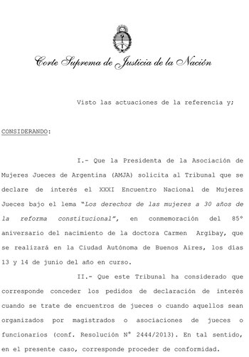 La resolución de la Corte, con firma digital de Rosatti, Maqueda y Rosenkrantz, dice, textualmente: “Declarar de interés el XXXI Encuentro Nacional de Mujeres Jueces bajo el lema ‘Los derechos de las Mujeres a 30 años de la Reforma Constitucional’, en conmemoración del 85º aniversario del nacimiento de la doctora Carmen Argibay, que se realizará en la Ciudad Autónoma de Buenos Aires, los días 13 y 14 de junio del año en curso”.