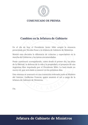 En otro comunicado difundido esta noche, el Gobierno dejó en claro los cuestionamientos severos a la gestión de Posse. “En el día de hoy, el presidente Javier Milei presentó la renuncia presentada por Nicolás Posse a la Jefatura de Gabinete de Ministros. Motivó esta decisión la diferencia de criterios y expectativas en la marcha del Gobierno y las tareas encomendadas. Posse continuará acompañando, como desde el primer día, las ideas de la libertad, la defensa de la vida y la propiedad y el proyecto de una Argentina libre, impulsado por el Presidente Milei. Lo hará desde un nuevo rol, que será dado a conocer en los próximos días. Esta semana se avanzará en una transición ordenada junto al Ministro del Interior, Guillermo Francos, quien asumirá el rol a cargo de la Jefatura de Gabinete de Ministros. Fin”.