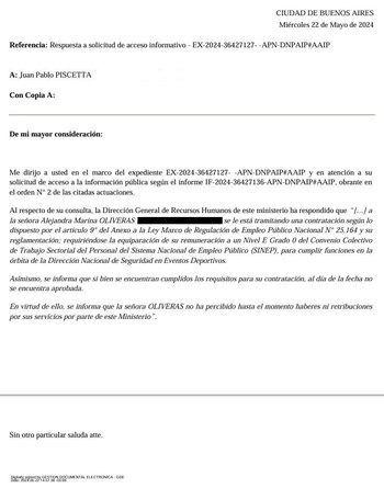 De efectivizarse ese trámite, el contrato de la deportista lo regirá el artículo 9° del Anexo a la Ley N° 25.164 marco de regulación del empleo público, que es el que se suele utilizar en el Poder Ejecutivo para sumar personal transitorio. Oficialmente, el sueldo será equivalente a un cargo de Nivel E Grado 0 del convenio colectivo del sistema de empleo público (SINEP), según consignaron ante la solicitud de información realizada.