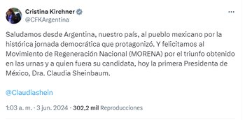 A través de la misma red social se pronunció la ex mandataria. “Saludamos desde Argentina, nuestro país, al pueblo mexicano por la histórica jornada democrática que protagonizó. Y felicitamos al Movimiento de Regeneración Nacional (MORENA) por el triunfo obtenido en las urnas y a quien fuera su candidata, hoy la primera Presidenta de México, Dra. Claudia Sheinbaum”, expresó CFK en las primeras horas de la madrugada de este lunes.