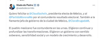 En la misma sintonía se expresó el Senador Nacional de Unión por la Patria, Eduardo “Wado” De Pedro. “Quiero felicitar a @Claudiashein, presidenta electa de México, y al @PartidoMorenaMx por el contundente resultado electoral. El pueblo mexicano fue contundente en las urnas. Eligieron continuar y profundizar las transformaciones. Eligieron un gobierno con sentido soberano, sensibilidad social y un modelo de crecimiento y desarrollo”, declaró el ex ministro del Interior.