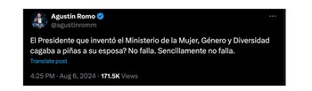 En la misma línea se expresó el diputado de la provincia de Buenos Aires, Agustín Romo. Con el estilo de lenguaje que suele dominar la red social X, Romo insistió en que fue Fernández quien reivindicó la importancia de contar con un ministerio que atienda las problemáticas de violencia de género en particular, y de las mujeres en general.