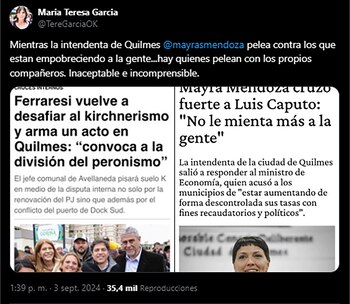 La legisladora consideró que “Mientras la intendenta de Quilmes, Mayra Mendoza, pelea contra los que están empobreciendo a la gente...hay quienes pelean con los propios compañeros”, en referencia a Ferraresi. García es una dirigente de diálogo con la ex presidenta Cristina Kirchner. Pese a haber sido ministra de Gobierno durante el primer mandato del gobierno de Axel Kicillof, siempre respondió orgánicamente a la ex mandataria. Tiene, además, cierta influencia en la estrategia electoral del peronismo en la provincia de Buenos Aires. En las últimas elecciones estuvo a cargo de la fiscalización de la fuerza, además de integrar la junta electoral del partido que conduce Máximo Kirchner.
