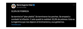 La diputada y ex gobernadora de Buenos Aires, María Eugenia Vidal indicó: “Se terminó el plan platita, los parches, se empezó a combatir la inflación. Y sólo quedó la realidad: 52,9% de pobreza. Esta es la Argentina que nos dejaron el kirchnerismo y sus gobiernos”.