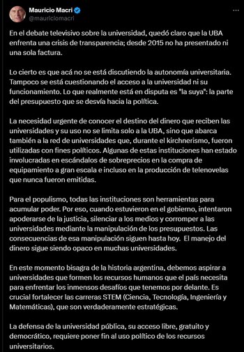 “La defensa de la universidad pública, su acceso libre, gratuito y democrático, requiere poner fin al uso político de los recursos universitarios”, afirmó Macri hoy en un posteo en su cuenta verificada de la red social X.