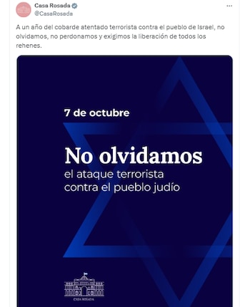 “A un año del cobarde atentado terrorista contra el pueblo de Israel, no olvidamos, no perdonamos y exigimos la liberación de todos los rehenes”, escribió en X la cuenta oficial de la Casa Rosada