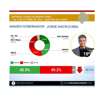 En cuanto a la Ciudad Autónoma de Buenos Aires, el jefe de Gobierno Jorge Macri, apareció en el puesto número 18, subiendo un escalón con respecto al mes pasado, y logrando durante la última encuesta una imagen positiva del 45,9% y una negativa del 49,2 por ciento.
