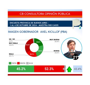 Por otro lado, el líder regional bonaerense Axel Kicillof, también subió una posición en relación a un mes atrás lo que lo ubicó en el puesto 21. Su imagen positiva es del 45,2% y la negativa del 52,3 por ciento.