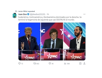 Otro posteo destacado por el mandatario argentino fue el que subió Juan Pablo Carreira, Director de Comunicación Digital del Gobierno y referente libertario conocido en las redes sociales como Juan Doe (@jdoedoe101101″). El funcionario subió una imagen que muestra juntos a Trump, Milei y Nayib Bukele (presidente de El Salvador) y escribió: “Sudamérica, Centroamérica y Norteamérica dominados por la derecha. Se terminó la hegemonía de izquierda que casi DESTRUYE el mundo”.