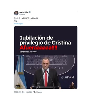 La decisión fue tomada por el jefe de Estado el miércoles, luego de que la Justicia confirmara la condena por corrupción contra la líder del Partido Justicialista (PJ). Y en un contexto de revuelo general por el anuncio oficial, Milei lanzó un mensaje en las redes sociales que refería de manera inequívoca a la máxima referente del kirchnerismo: “El que las hace, las paga. Fin”.