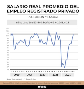 Con tres meses consecutivos de crecimiento del empleo asalariado registrado en el sector privado, el Gobierno ya habla de la consolidación de una tendencia de recuperación de los puestos de trabajo, mientras que destaca otro número positivo que se mantiene: sigue el alza del salario medio real del empleo registrado privado. Son dos de los datos de octubre y noviembre de 2024 que difundirá la Secretaría de Trabajo en las próximas horas y que, según fuentes oficiales, “quiebran una fase contractiva en donde se acumularon 11 meses consecutivos de caída neta de empleo con la pérdida de 180.000 puestos de trabajo”.