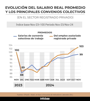 De las estadísticas también surge que la capacidad de compra del promedio de los salarios establecidos en los principales convenios colectivos de trabajo aumentó un 0,5% en noviembre de 2024 respecto del mes anterior. En el período comprendido entre enero y noviembre, la media de los salarios conformados por convenio registró un crecimiento acumulado de 12 puntos porcentuales.