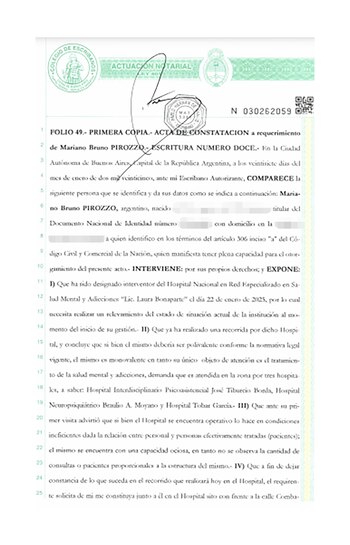 Según el “Folio 49″ del acta notarial 030262059 firmada por el escribano Pablo Hernán De Santis a lo largo de la inspección ocular por los edificios que componen el Hospital Nacional en Red “Licenciada Laura Bonaparte” se registraron las siguientes situaciones: