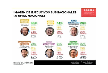 A su vez, el estudio hizo foco en otros mandatarios subnacionales. Los cinco con mejor performance son Rogelio Frigerio (gobernador de Entre Ríos), con 35% de imagen positiva y 24% de negativa; Jorge Macri (jefe de Gobierno porteño), con 34% de imagen positiva y 29% de negativa; Maximiliano Pullaro (gobernador de Santa Fe), 28% de imagen positiva y 24% de negativa; Diego Valenzuela (intendente de Tres de Febrero), 24% de imagen positiva y 18% de negativa; y Martín Llaryora (gobernador de Córdoba), 22% de imagen positiva y 25% de negativa.
