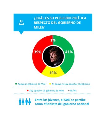 La consultora preguntó a los encuestados sobre su posición política respecto del gobierno de Milei. Cuatro de cada 10 (41%) respondieron que apoyan, y en la misma proporción (39%), que son opositores. Una porción importante (el 19%) no se percibe ni a favor ni en contra.