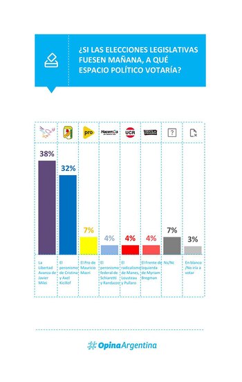 La respuesta se agrupó en favor de La Libertad Avanza de Javier Milei en un 38%, contra un 32% de “el peronismo de Cristina y Axel Kicillof”. Muy detrás aparece “el Pro de Mauricio Macri” (7%) y otros espacios con menos del 5% cada uno. Además, el 7% consideró que no sabe a quién votaría.