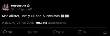 Además del presidente Milei, el ministro de Economía, Luis Caputo, también se manifestó en X, donde elogió el rendimiento de algunos de los futbolistas argentinos. “Mac Allister, Enzo y Juli son buenísimos”, escribió el funcionario, en referencia a los autores de tres de los cuatro goles del equipo.