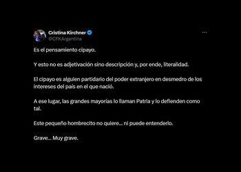“Es el pensamiento cipayo.Y esto no es adjetivación sino descripción y, por ende, literalidad.El cipayo es alguien partidario del poder extranjero en desmedro de los intereses del país en el que nació.A ese lugar, las grandes mayorías lo llaman Patria y lo defienden como tal. Este pequeño hombrecito no quiere... ni puede entenderlo. Grave… Muy grave", respondió la ex presidenta.