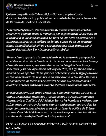 CFK compartió un fragmento a un comunicado que emitió la secretaría de Defensa del Partido Justicialista (PJ), en el que citó un fragmento en el que se cuestiona con dureza el abordaje oficial del reclamo argentino en las islas del atlántico sur. El texto advierte que la “sobreideologización, desfinanciamiento y mala praxis diplomática resumen lo actuado hasta el momento por el gobierno de Javier Milei en lo relativo a la Cuestión Malvinas”.